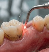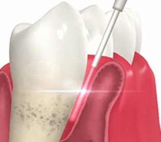 歯周ポケット内の炎症を起こしている組織を殺菌し高熱で分解除去していきます。その際レーザー照射と同時に霧状に出る水で歯周ポケット内を洗浄していきます。